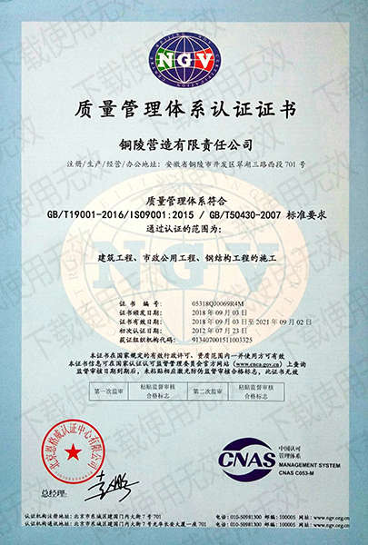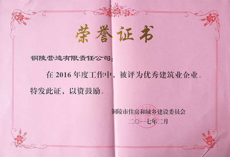銅陵營造有限責任公司是國家住建部核準的房屋建筑總承包一級企業。2006年7月,企業二次改制為民營企業,并更名為“銅陵營造有限責任公司”。目前,公司擁有房建施工總承包、市政公用工程總承包、鋼結構專業工程承包、建筑裝修裝飾專業工程承包四項壹級資質,機電安裝、起重設備安裝、建筑幕墻三項貳級資質,地基與基礎一項叁級資質。2008年通過北京恩格威ISO9001、ISO14001和OHSAS18001“三合一”體系認證。